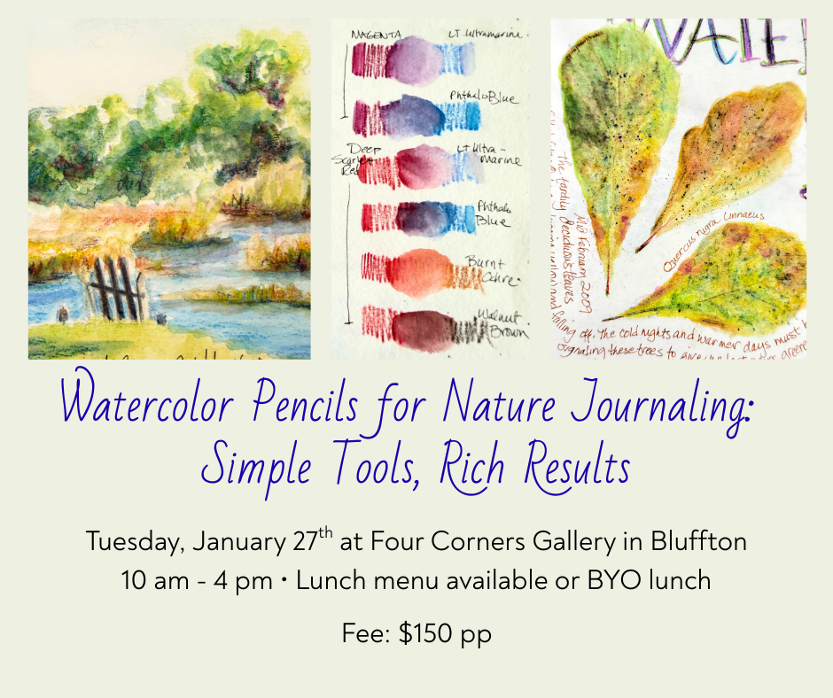 Join in to explore texture, water control, and expressive mark-making. Watercolor pencils are a joy to work with. They helped me begin my plein air sketching journey many moons ago. So easy to carry, such rich results!